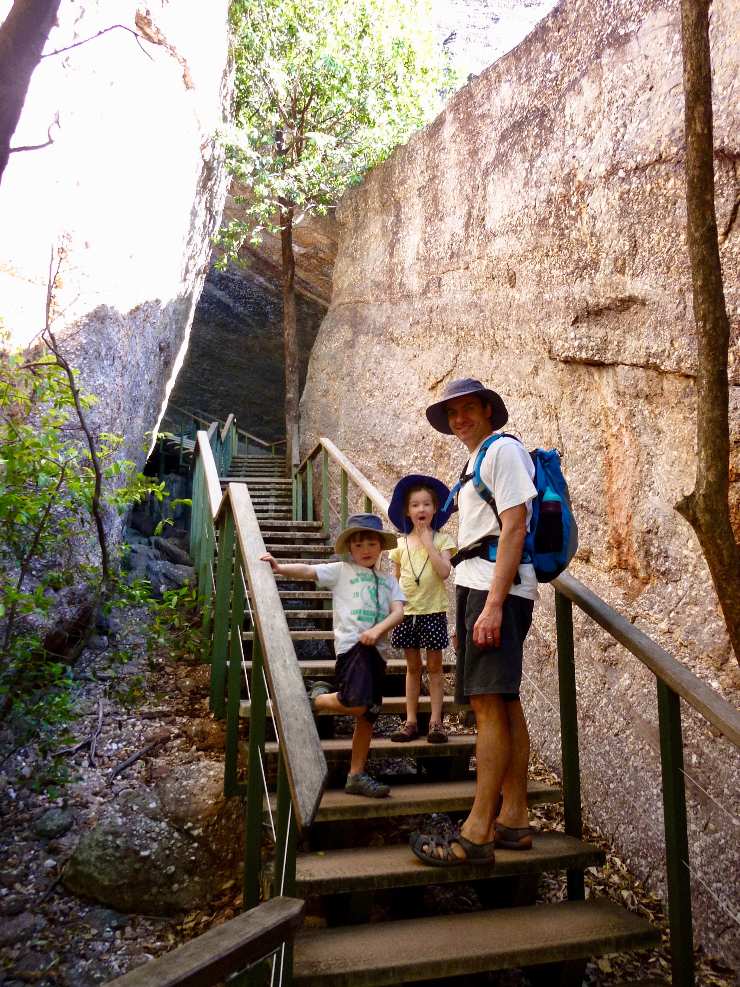 As Em commented to me as we approached the crest of the highest rocky outcrop to view more awe inspiring vistas, the children looked down at the ground the whole way while the adults gazed upwards with wonder in their eyes. Amy and Oliver each returned to camp with a container full of sparkling and “precious” crystals (rocks to you and me). The rock art is best described by the photos we took. I was more struck by standing in huge cavernous shelters in the escarpment itself knowing that a whole race of people had lived, loved and laughed there as long ago as 20,000 years.