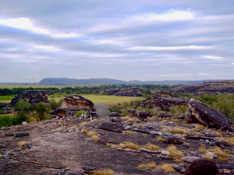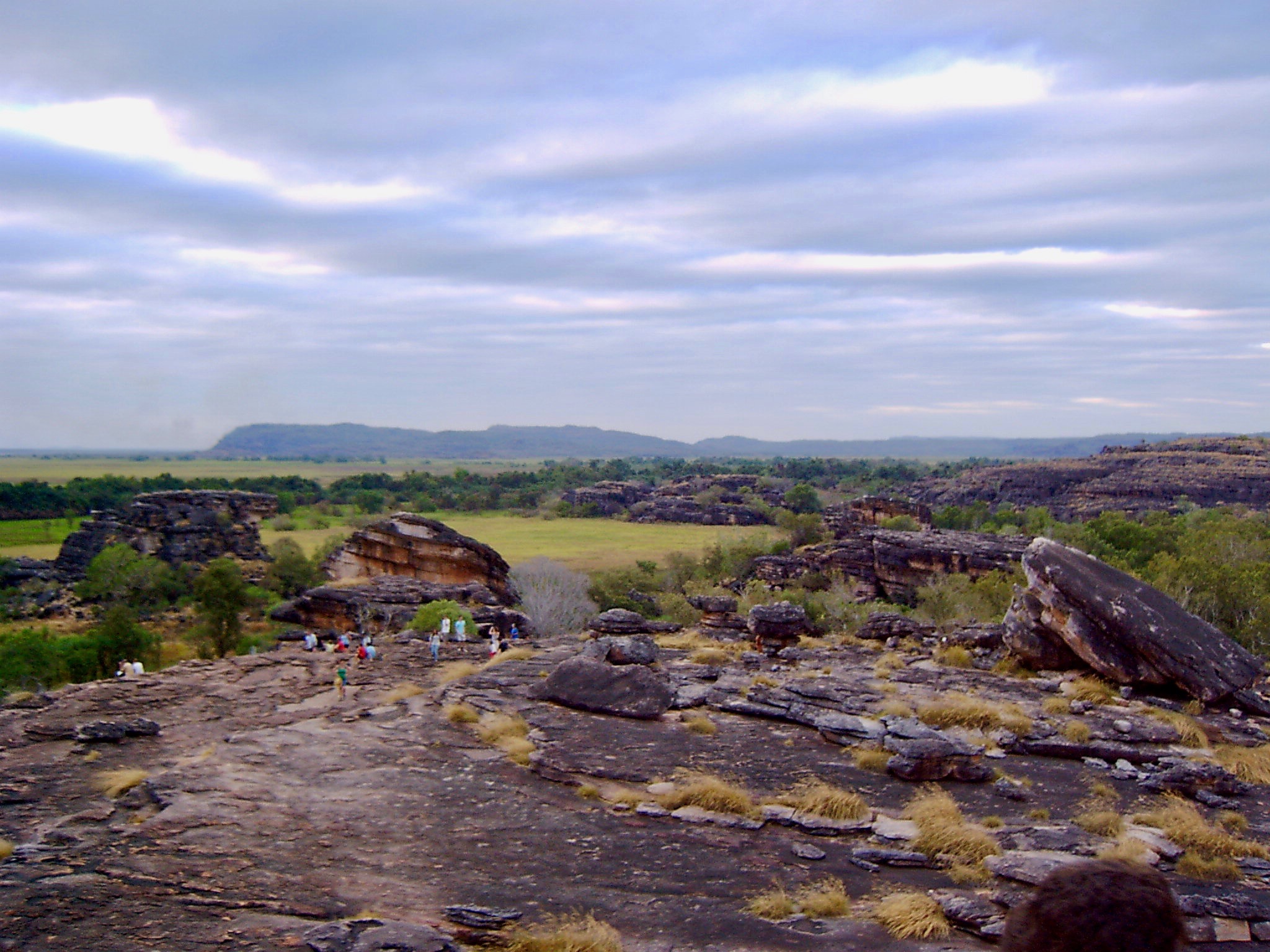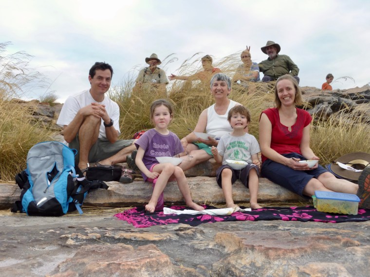 Back to camp for lunch, a few loads of washing and a couple of hours of fun in the pool for A & O. Then ever hopeful despite the gathering clouds off we set with dinner packed safely ain backpack to Ubirr rock to watch the sun set. A &O were feeling a little under the weather by this time, but miraculously found their second wind when we got to the base of the 700 metre rock climb. Dinner under clouds (no sun to be seen) was delicious (thanks Em) the vista still spectacular. As dusk fell is grannie set off down the hill ahead of the rest to ensure she could still see where to put her feet. Needless to say A & O needed little rocking tonight. I wonder what Greg has in mind for tomorrow.