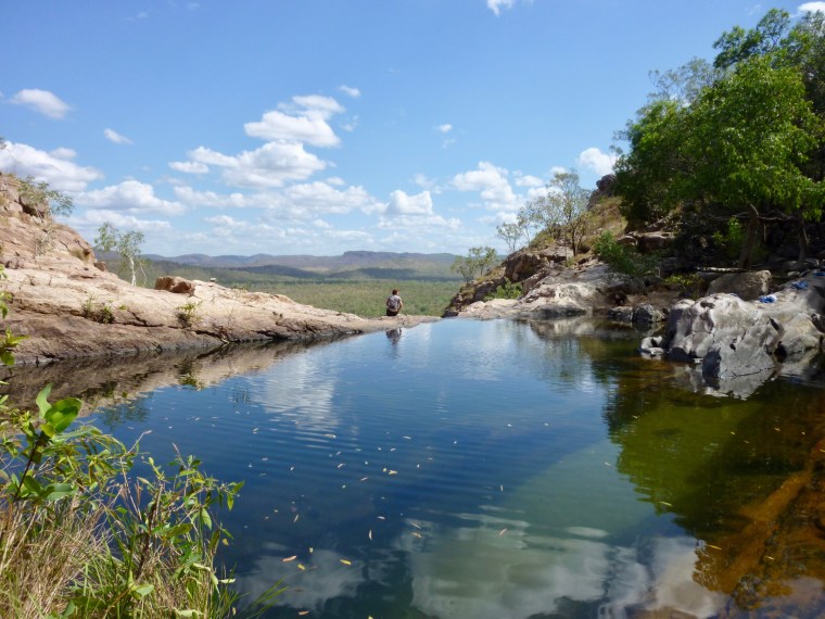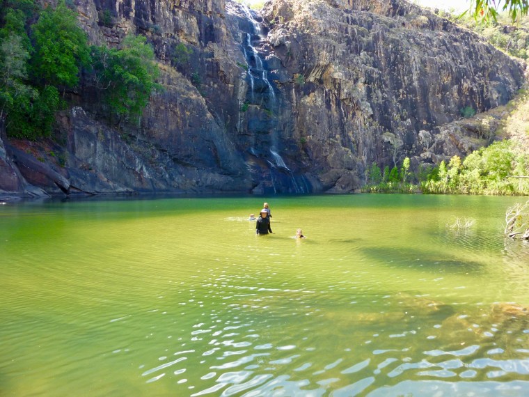 Emma: After a short walk to the Gunlom Falls it was decided the trip in was definitely worth it. A refreshing dip in the amazingly scenic pool was only slightly marred by us being the only ones in there. Most people would have been thankful, but Greg being a little paranoid about such matters felt the need place his mum on croc watch and to jump at various shadows. He even felt the need to inquire as to how I was going on my swim across to the base of the falls, all of 50 meters.