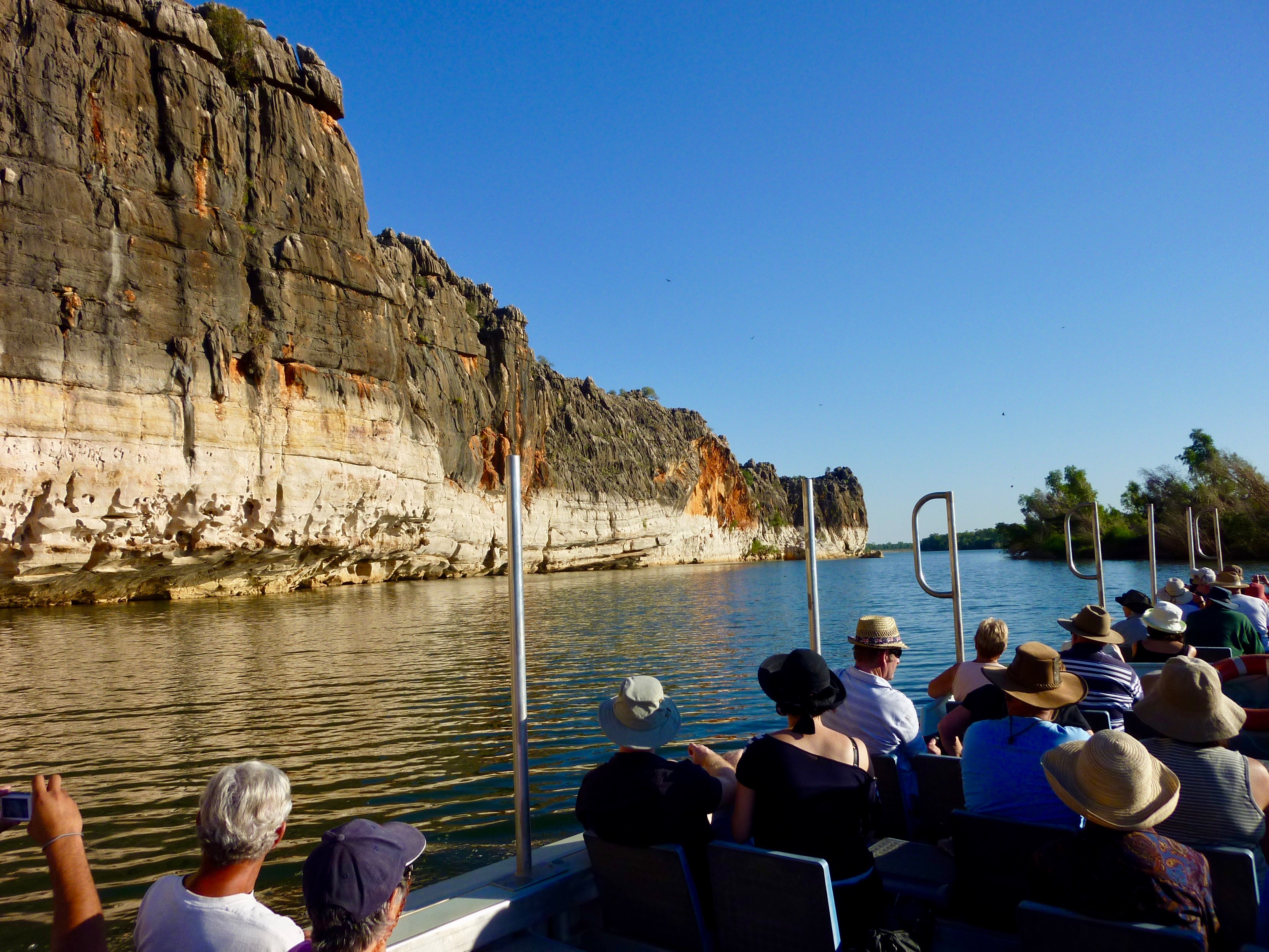 At Fitzroy Crossing we visited Geike Gorge once again to participate in the live tourist trade. No need to book, they run four cruises a day each capable of taking 180 passengers! It was well worth the visit though and good value at $60 bucks for all of us. The Gorge has been formed by the mighty Fitzroy River which at full flow would apparently fill Sydney Harbour in about 5 hours. No wonder it has worn its way through the Devonian era coral reef system which makes up the limestone rock. Lots of freshies basking on the banks, but I think we were all more taken with the swallow nests nestled under the overhangs like upside down mud igloos. Swallows launch out in droves, dive for insect from the water surface before expertly swarming back into their homes.