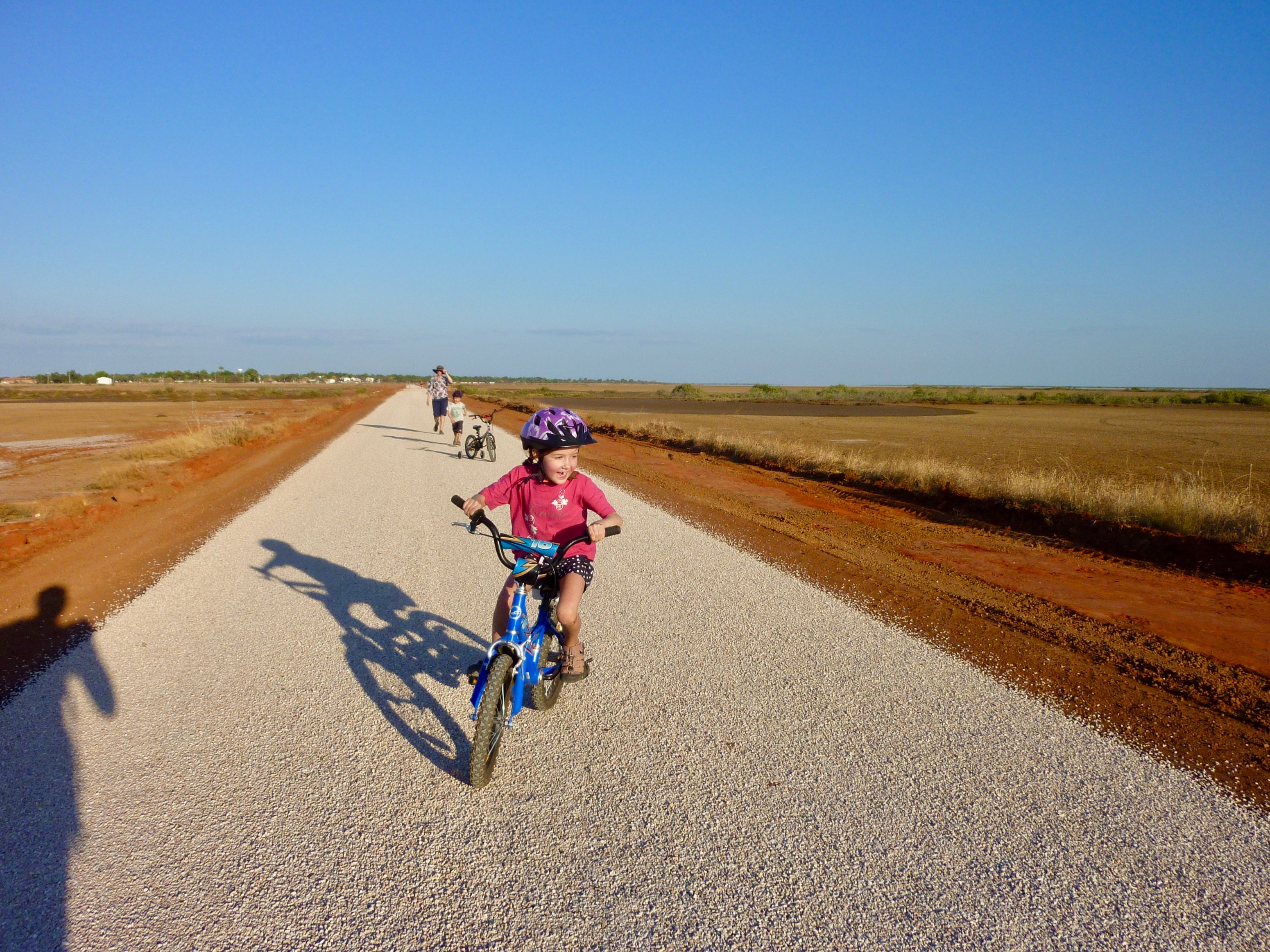 On the way we encountered a peloton… Cycle for SMILE. From their website: The SMILE (Supporting Medical Innovation for Life Enhancement) Foundation provides financial assistance to families whose children suffer from rare diseases as well as much needed funding into medical research. We took some photos… Amy and Oliver thought Grandpa Brucie might like to join them… Much flatter than the Italian Alps out here! The peloton was supported by an amazing crew, we got to see them in action at Warmun or Turkey Creek where we stayed that night. They had about 30 matching tents set up, dinner cooking, air beds blown up and a massage table at the ready when the group arrived in the afternoon. It was impressive. And they were packed up and gone before we got up the next day!