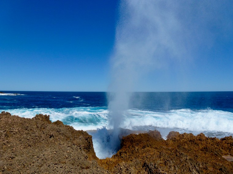 A visit to the Blowholes north of Carnarvon was definitely worthwhile. Not only was the blowhole blowing magnificently, there were heaps of whales out to sea. Some close to shore, lolling about, we could see their backs arching through the water. Just down the road was a little lagoon where we spent a lazy afternoon. Well I did at least. Greg snorkeled and walked with Grandpa Brucie and the kids to the point at the end of the beach multiple times. There were some good rocks to climb and the kids went up and down repeatedly. By all accounts the snorkeling was amazing, aquarium-like with many of the same fish as at Ningaloo and some new ones as well.