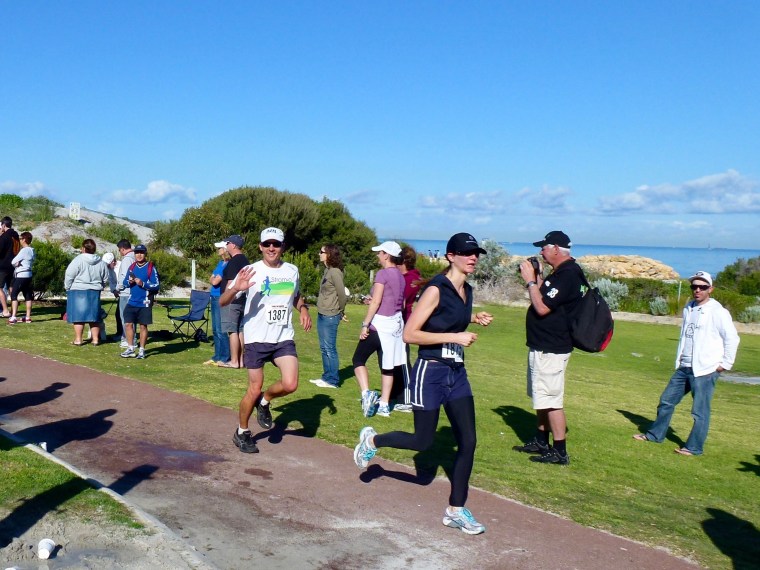 So on a brisk Fremantle morning we bundled ourselves and the kids out of bed and into the car at 6.45 am. Emma packed an esky with milk, bananas and cereal for herself Amy and Oliver to eat in the park the start of the race at South Beach. I had to be there well before the 7.40 am kick off because my entry number was not at the Fremantle post office as it ought to have been when we arrived here last Friday (two days ago).