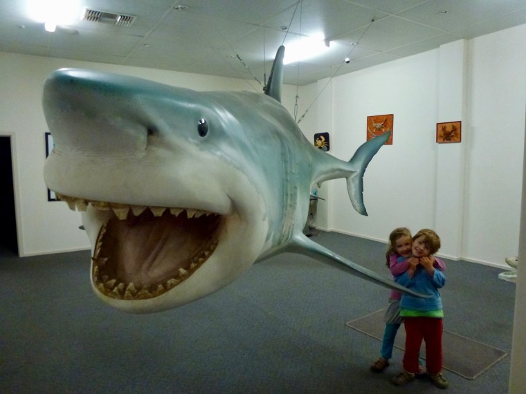 So having failed on our fishing mission (it was too windy anyway) we visited the display at the Shell servo of the biggest fish ever caught on a 24 kilo fishing line which was, if you believe it, a 1.5 tonne great white shark. It’s gotta a be a fishing story doesn’t it? Oliver’s $22 Jarvis Walker fishing line from Kmart is a 24 kilo line and I’m sorry but I just can’t believe it could reel in a one and a half tonne great white shark. I thought it would snap under the weight of our 20 cm rock cod back in Bremer Bay. Still that’s what ‘they’ say.