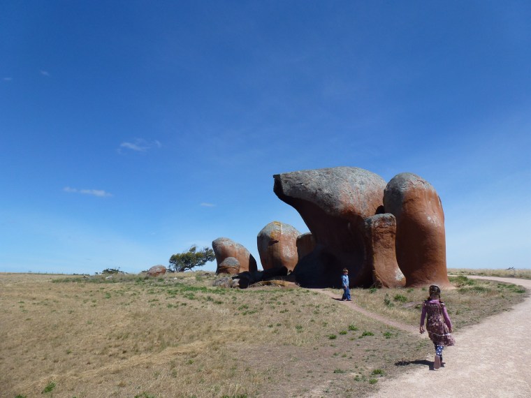 We left Streaky Bay headed for Coffin Bay near Port Lincoln but only made it half way. A 35 km an hour head wind forced us into an early retreat at Elliston only half way. But before we got there we visited Murphy’s Haystacks and the Venus Bay pelicans, or rather they visited us during lunch. The former of which we picked up from that wonderful traveling reference book ‘Are we the yet’ by Allison Leciester (thanks Louise for letting me borrow your line from a comment on our blog some time back). We just keep ticking off the sights!