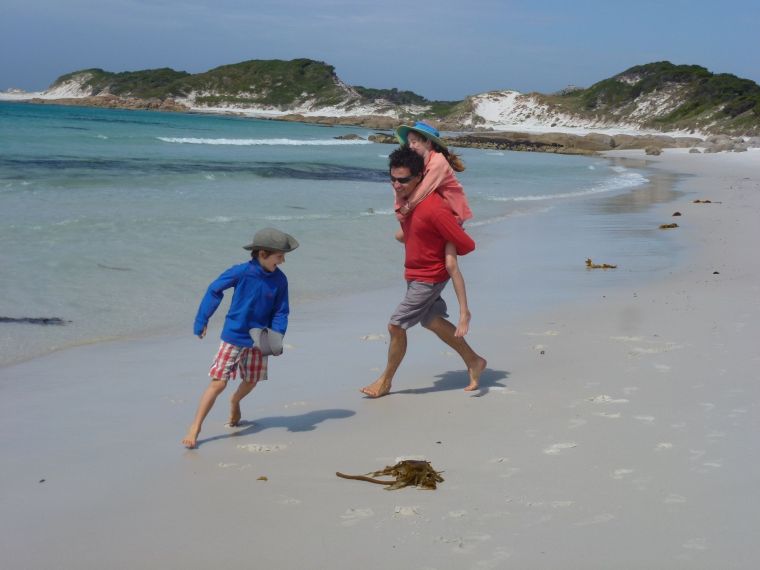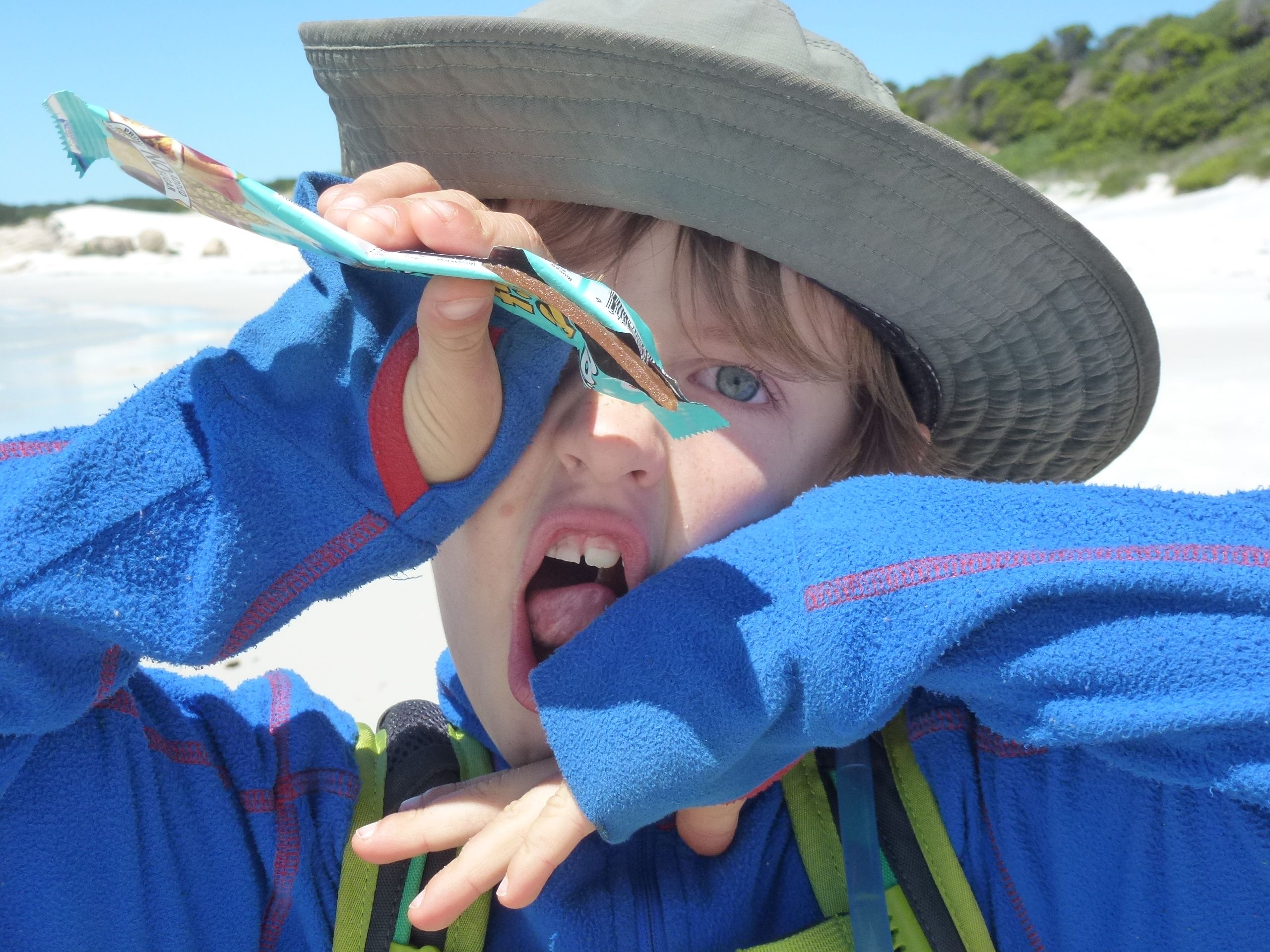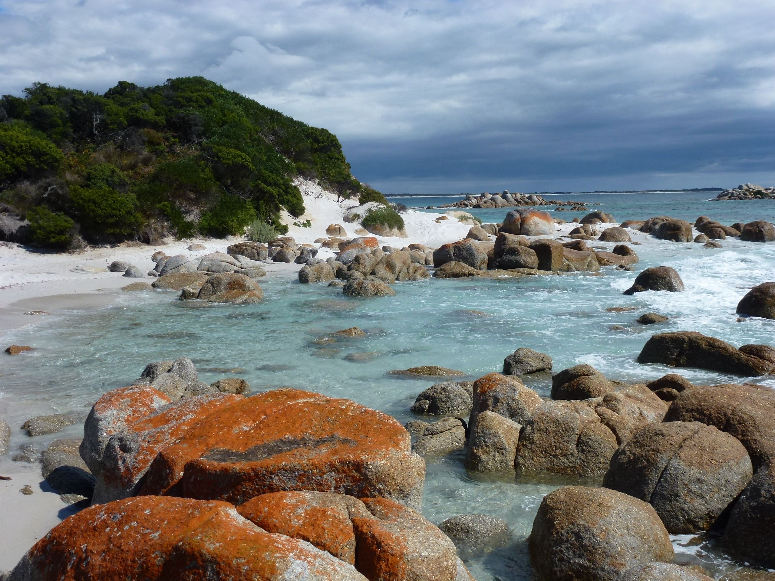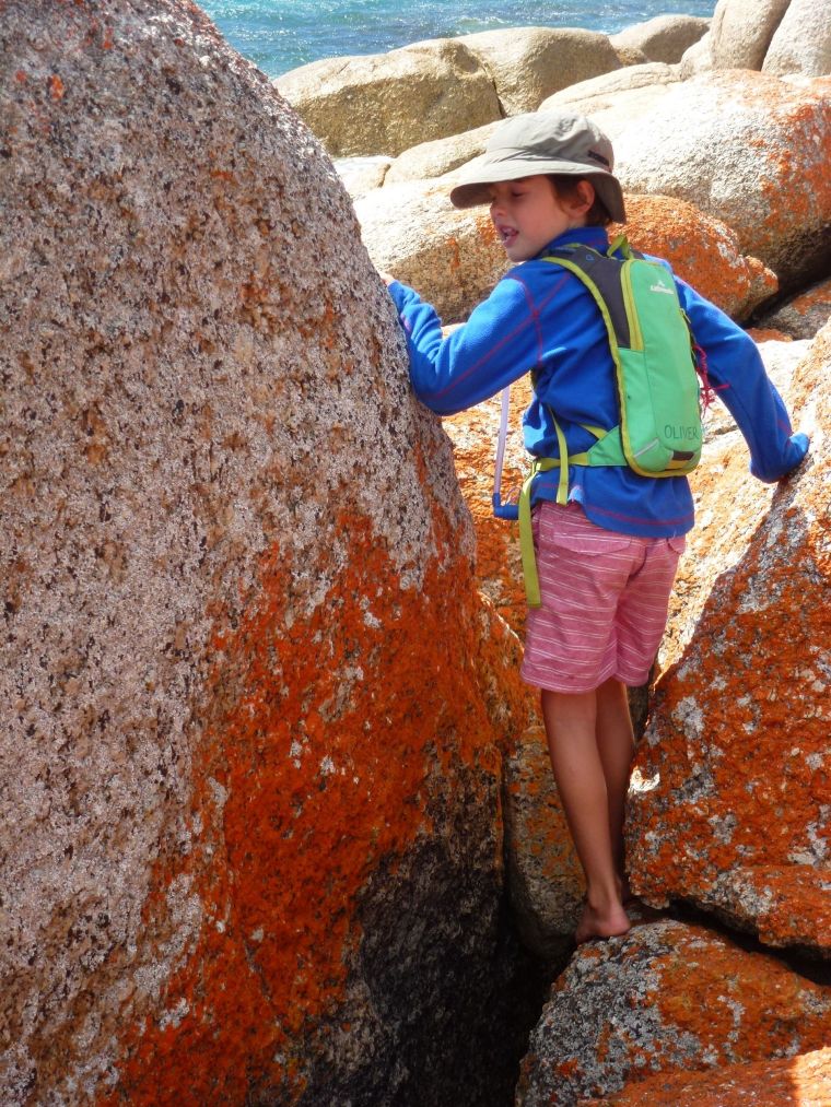 That’s it, it’s war! I peeked my head around a rock, caught Oliver’s eye and then with every muscle straining I screwed my face into the most grotesque look I could muster. Oliver looked away, but he knew I had him. Not even he could deny he had caught my dirty look. Now he was out for revenge, but I assiduously averted my eyes, determined not to catch a return look. So passed a gorgeous 7 km stroll along the beaches of Mt William National Park, ducking and weaving in and out of orange lichen covered boulders, strewn as they are amongst the white sandy shores.