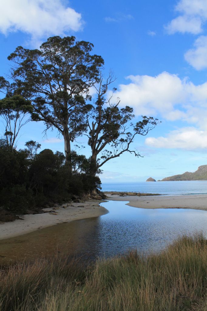 In any case, Bruni was not the only European to drop by all those years ago. Captain Bligh dropped in, presumably before the mutiny, as did Captains Cook and Furneaux, Tasman and others. When they did, at least a few of them pulled up to fill their water barrels from the stream at Two Tree Point in Adventure Bay. Two Tree Point was named after the trees that stood at the mouth of the creek – and they’re still there albeit substantially larger today than in the painting by George Tobin, Lieutenant General no less, and chief expedition artist. I love that, to think those same said trees link such vastly different times.