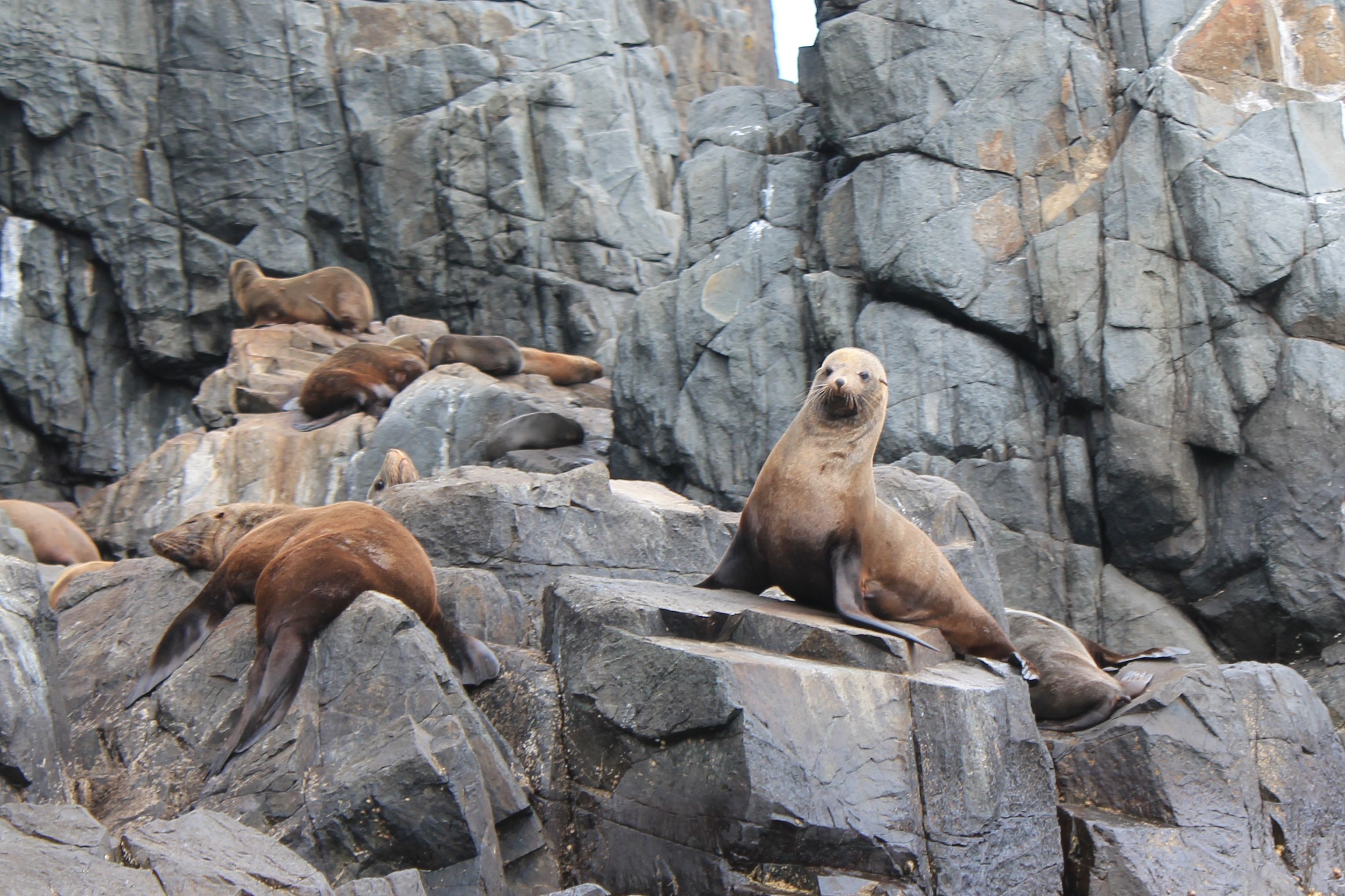 Friar Rocks, kilometres out off Bruny itself was the turn around point but only after we awoke several hundred sleepy sea lions to pose for the cameras. After that we went further offshore, in search of albatross the skipper said. Sure enough albatross we found, by the dozens along with shearwaters and a bunch of other remarkable birds on the wing. And then, just when I thought I’d died and gone to heaven, a pod of at least a hundred dolphins started chasing us down from all directions. Does this happen every day? Apparently not, but who were we to complain. The birds swooped, the dolphins leapt and we wished it could go on all day.