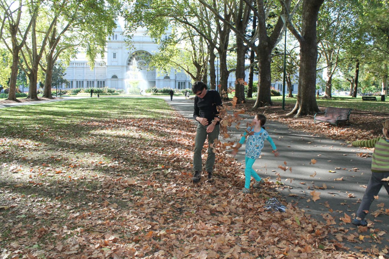 A happy face soon re-emerged though, amongst the autumn leaves in the lovely and quiet park in front of the Royal Exhibition building. Nothing like a leaf fight to put the sulks away.