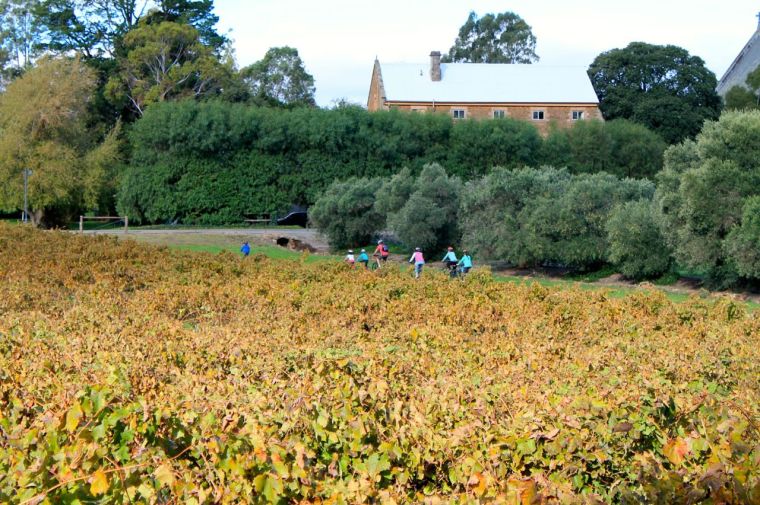 From Naracoorte it is a lazy 460 kilometres to Clare. Gorgeous old eucalypts mingled with vines turning golden yellow and orange as the autumn progresses. We rode our bikes along the Riesling Trail to the Sevenhill winery. Paul, Khia and I sampled the wines while Dana held school lessons for Amy, Oliver and Evie. Emma must have been amused by the goings on of both.