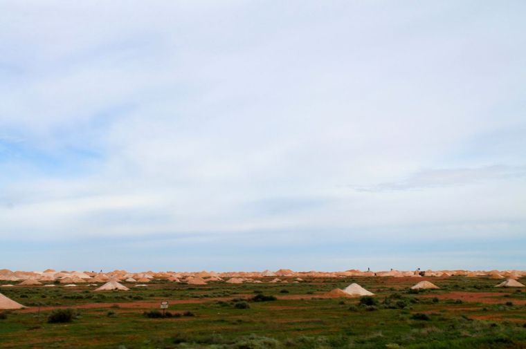 Just outside Coober Pedy, 375 kilometers from Woomera, dirt mounds begin to appear. Just a few at first and then a whole lot of them until the conical piles replace the desert shrubs, like a rabbit warren in a population explosion. The rabbits though are humans, rabid for opal. Signs line the highway, ‘Caution deep shaft’ with pictures of people falling down deep holes. The dirt piles are the ‘mullock’ heaps dug up from below, huge amounts of earth pushed aside in search of tiny rainbow rocks.
