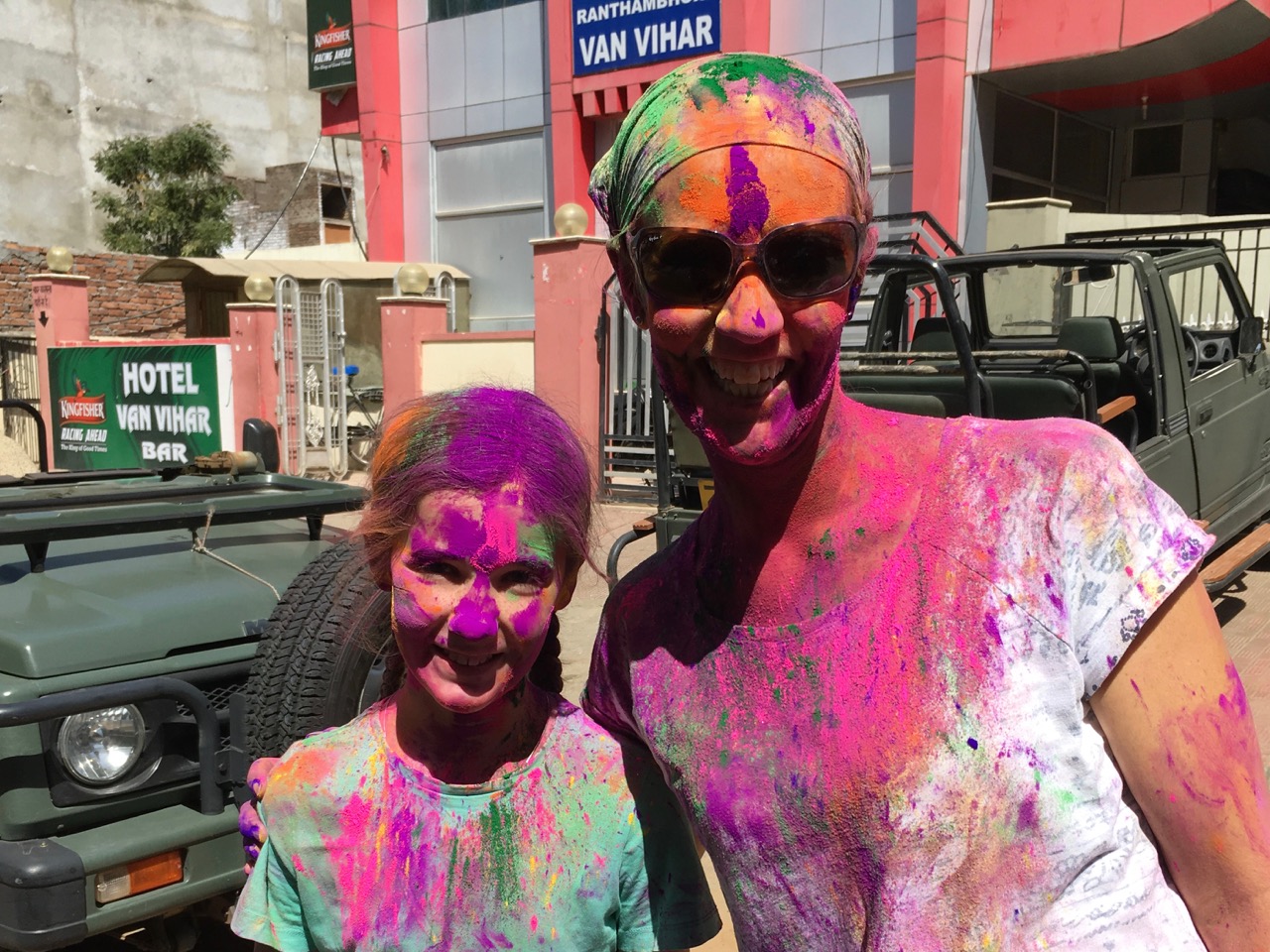 The next day was Holi. We didn’t really know what to expect or even if we were in the right place to observe any of the goings on. We walked out into the streets hoping to see some colour and movement but unsure what we would find. Within minutes we were coloured from head to toe by different groups of young men all eager to help a family of foreigners experience the fun.