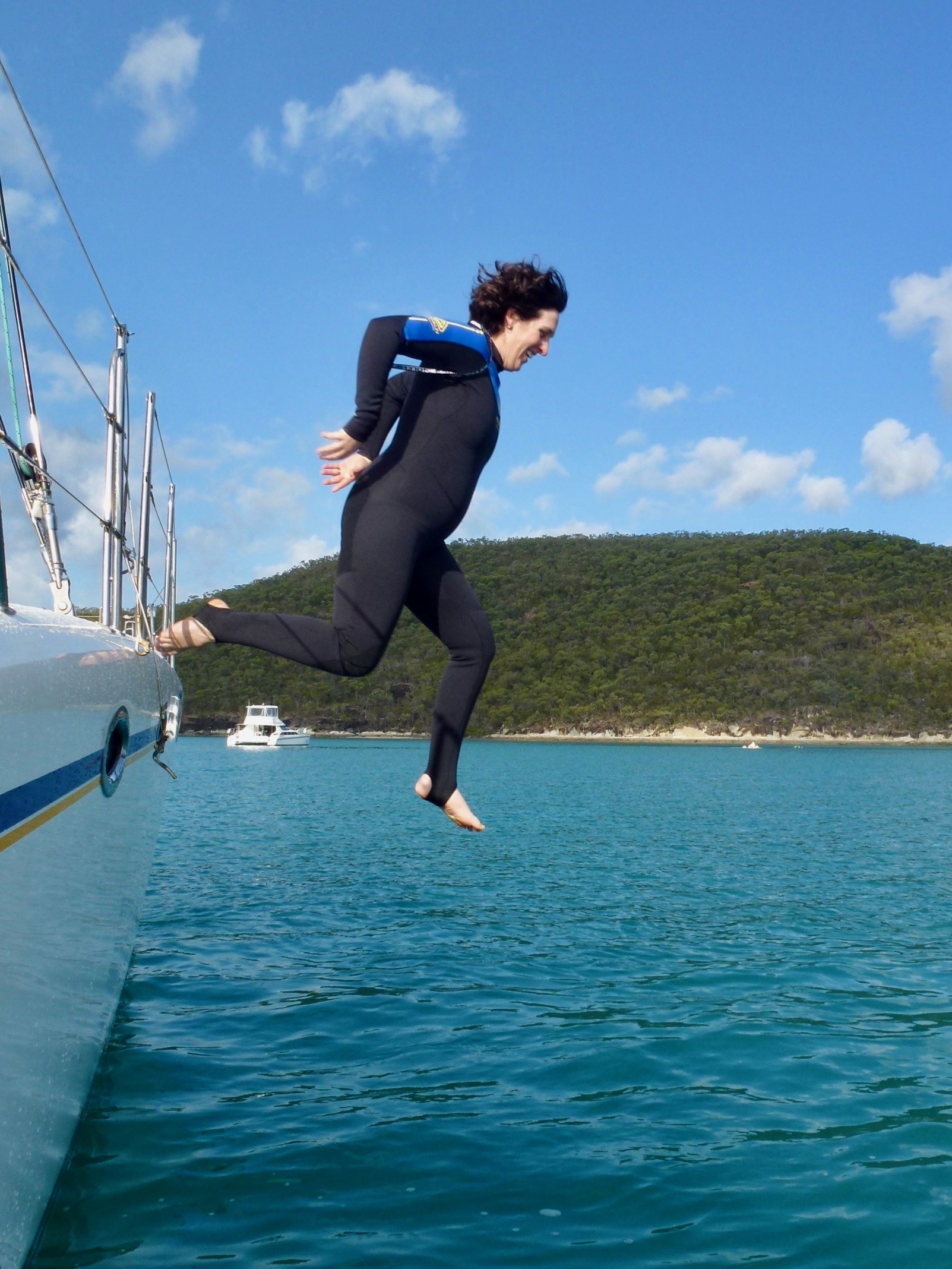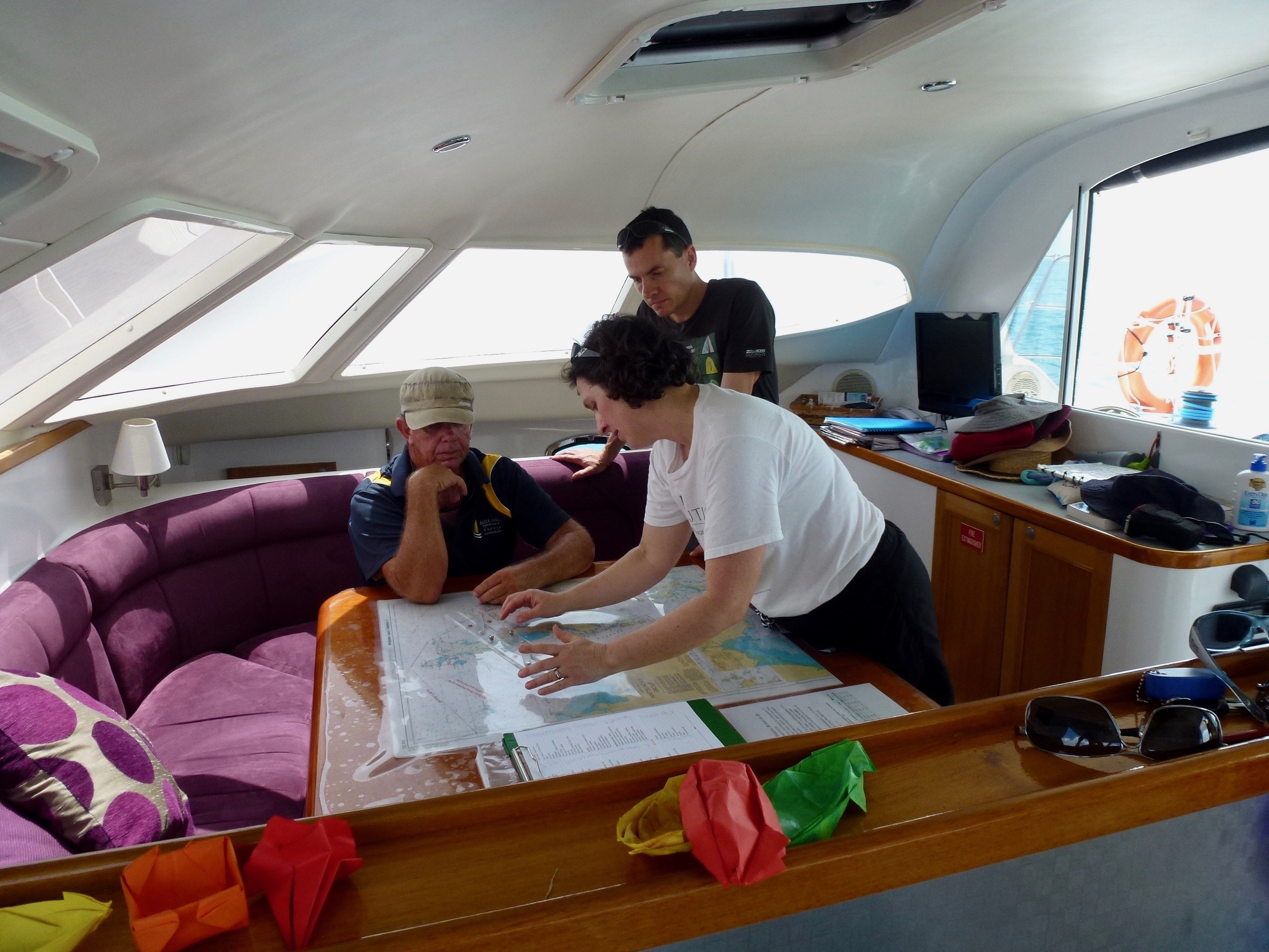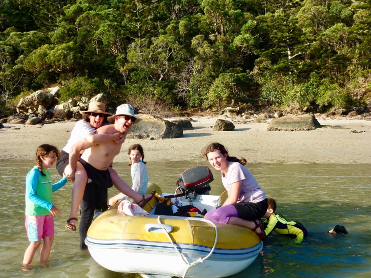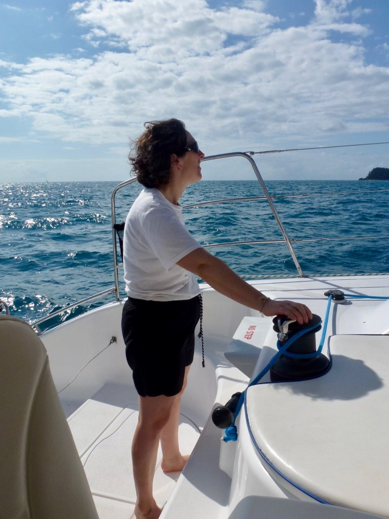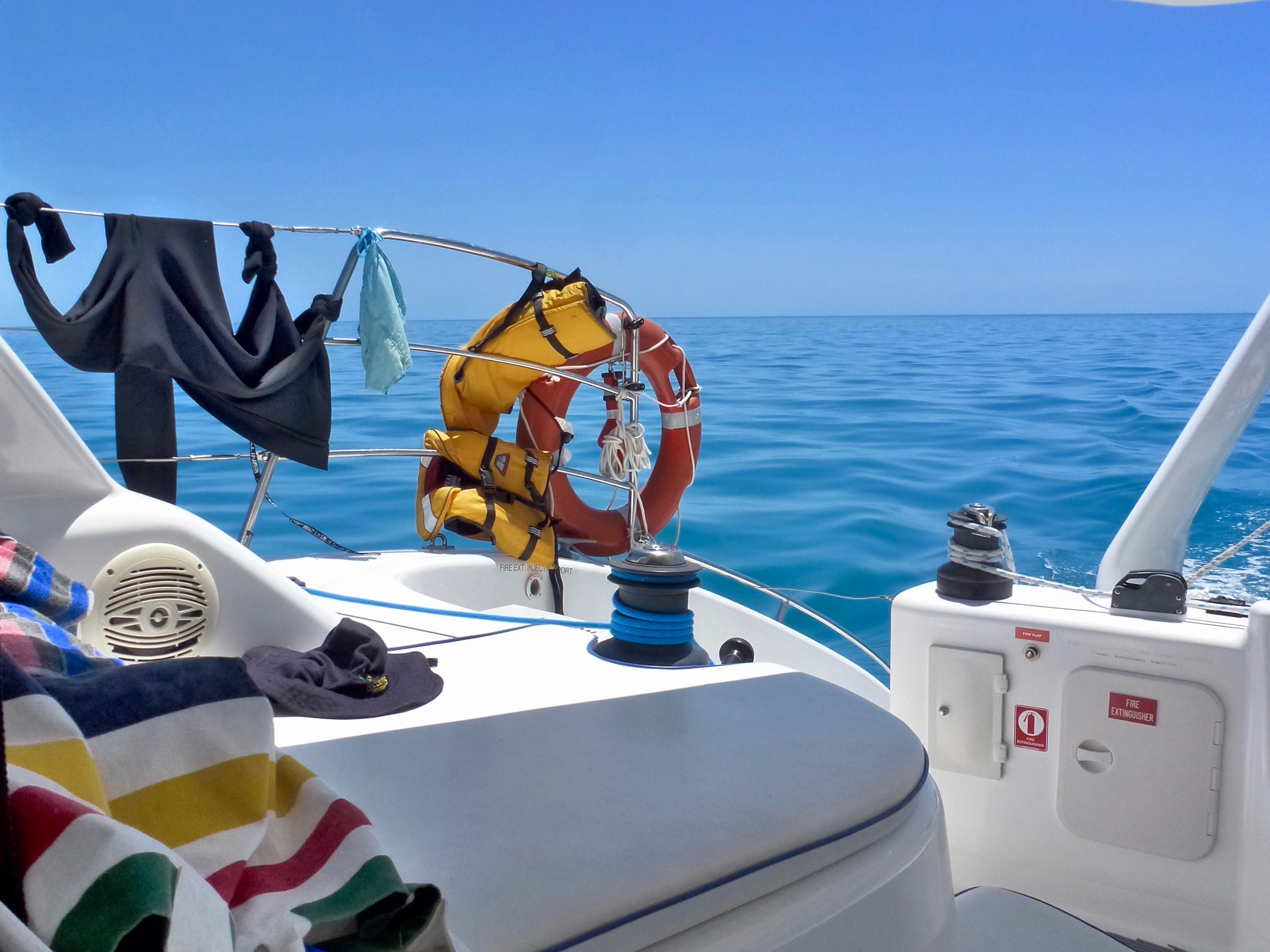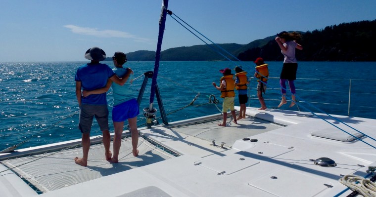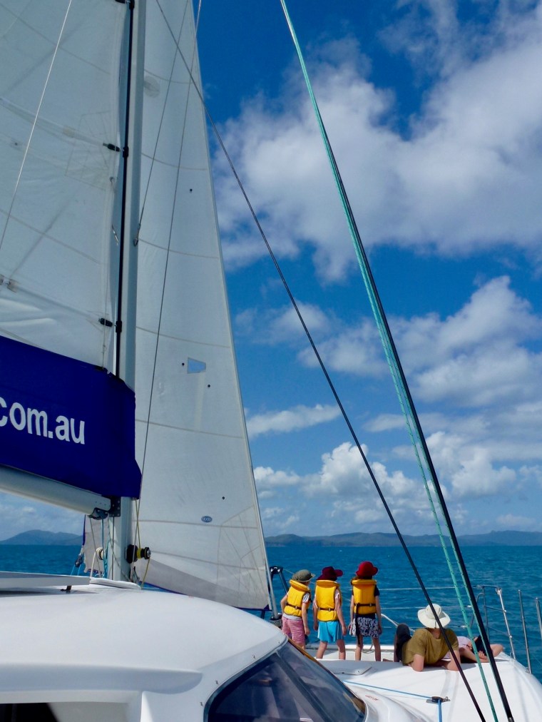 Razzle Dazzle was rising and falling under our feet. Dana, Amy, Evie and Oliver were surfing the swell. Khia was right where she wanted to be – at the helm. Luncheon Bay, another beautiful snorkelling spot, was round the corner. We dreamt of keeping Razzle Dazzle and pondered how we got so lucky.