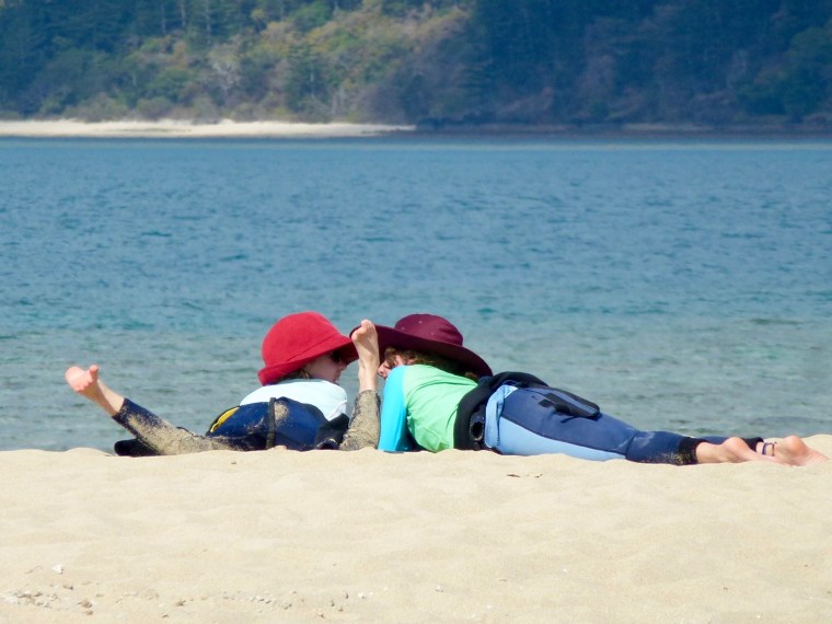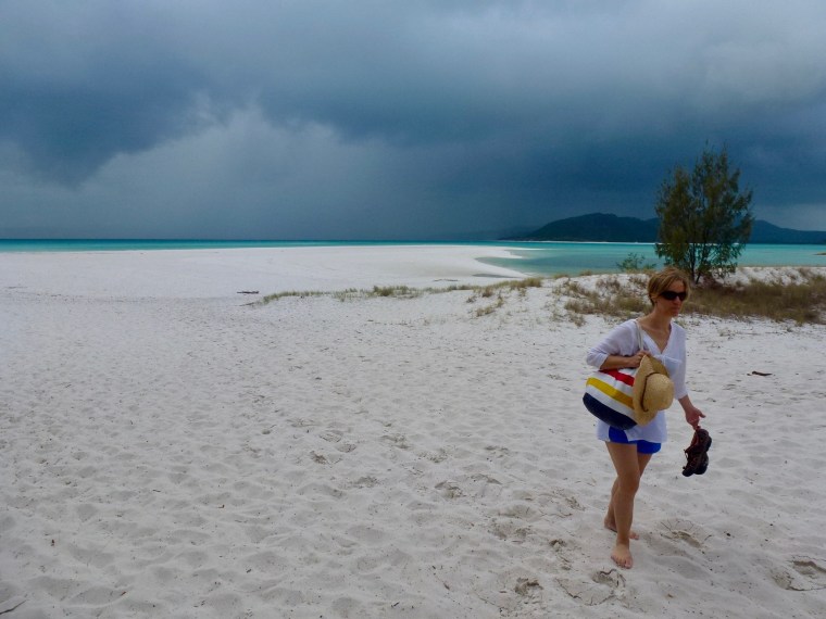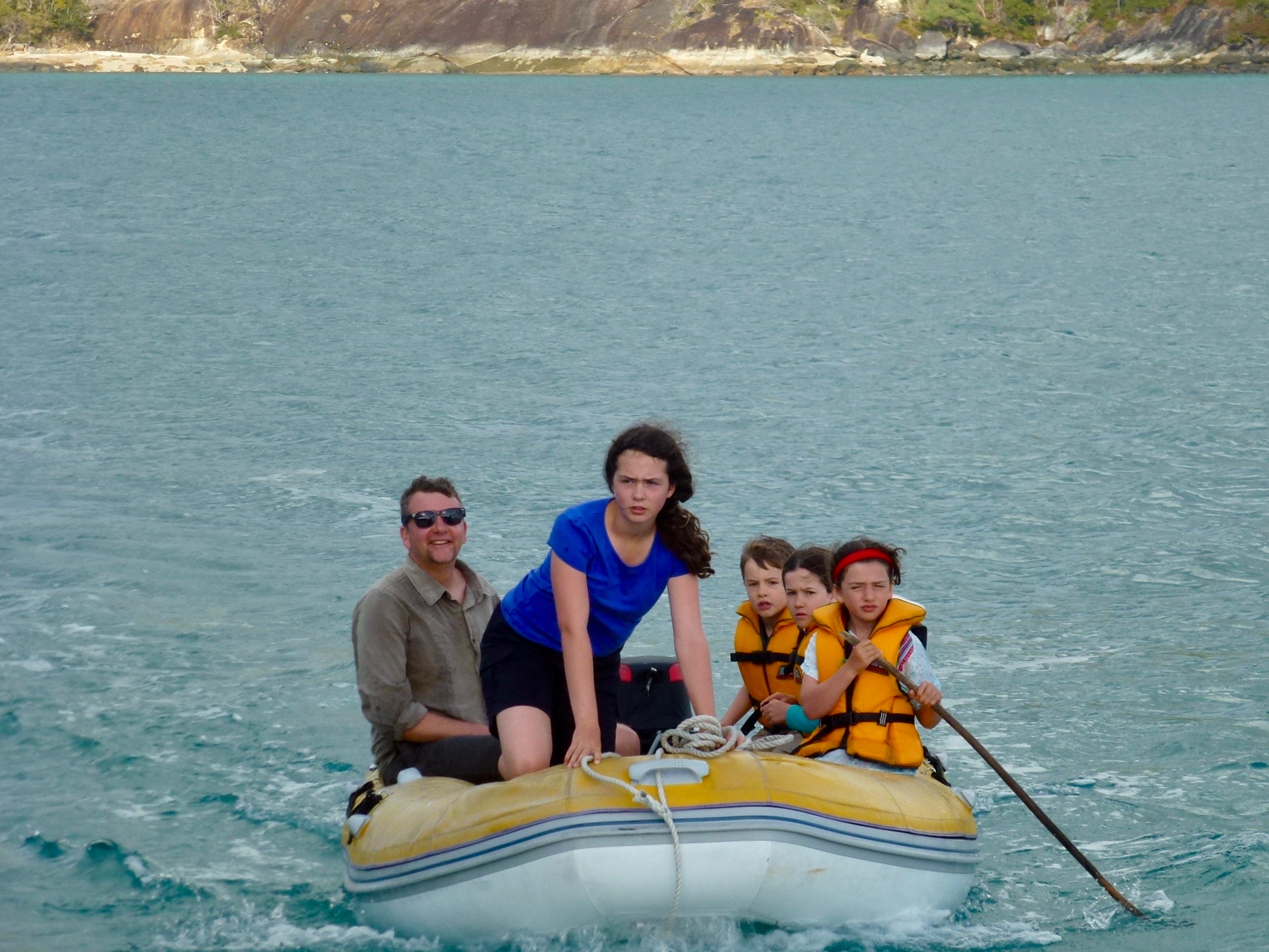‘Come on time to go’. We raced to gather up our things. Storm clouds were brewing on the horizon and it was clear they were headed out way. Dana, Amy, Evie and Oliver reluctantly tore themselves away from their drip castles. As we walked back over the point to our dinghy a little competition broke out to see who could get the stream of backpackers flowing the opposite way to acknowledge us. We headed over the water Razzle Dazzle as the rain started to pour. ‘Suckers!’, Paul muttered at the backpackers, to guffaws of laughter from the rest of us.